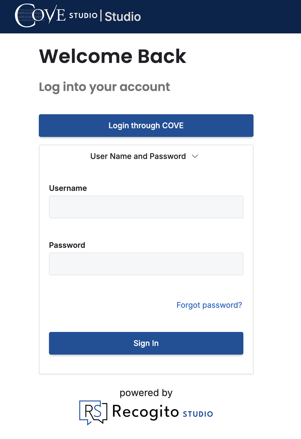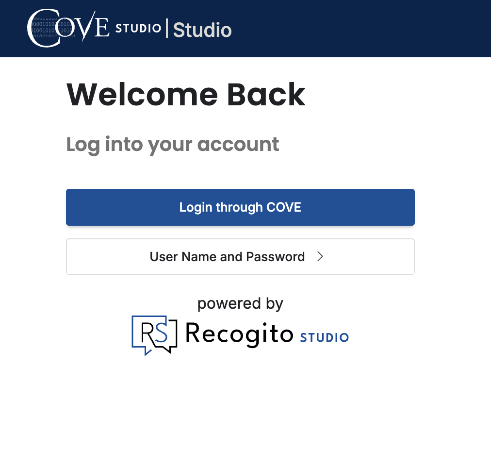 To reset your COVE Studio password, first click the “Login through COVE button”: